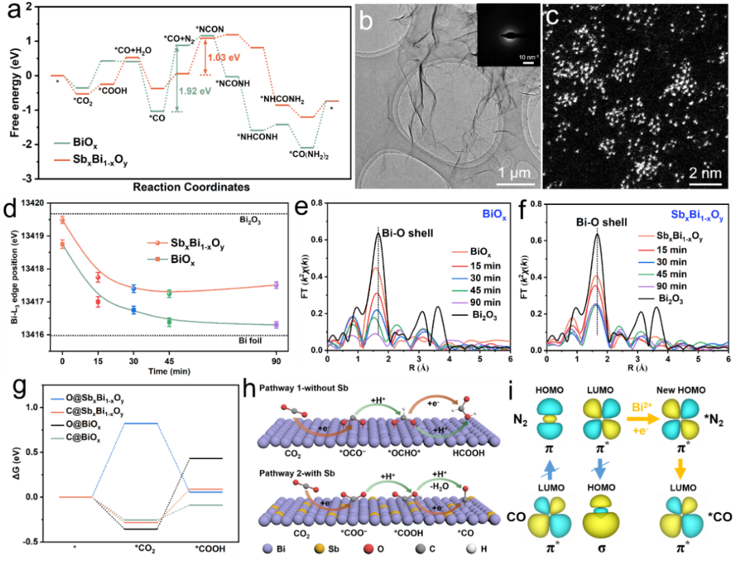 本工作成功构筑了非晶氧化铋锡纳米片电催化剂,优化了以NO3-和CO2为原料合成尿素过程中C-N偶联的反应路径。在非晶氧化铋锡/rGO纳米片中原子级复合的Sn有效地增强了对CO2的吸附和活化,实现了基于*CO2而不是传统的*CO为关键中间体的C-N偶联途径,实现了高效的C-N偶联过程,最终获得了78.36%的高尿素合成法拉第效率。该项研究为进一步开发多电子、多步骤反应的C-N类化合物合成的高效催化剂提供了一种可借鉴的新思路。
